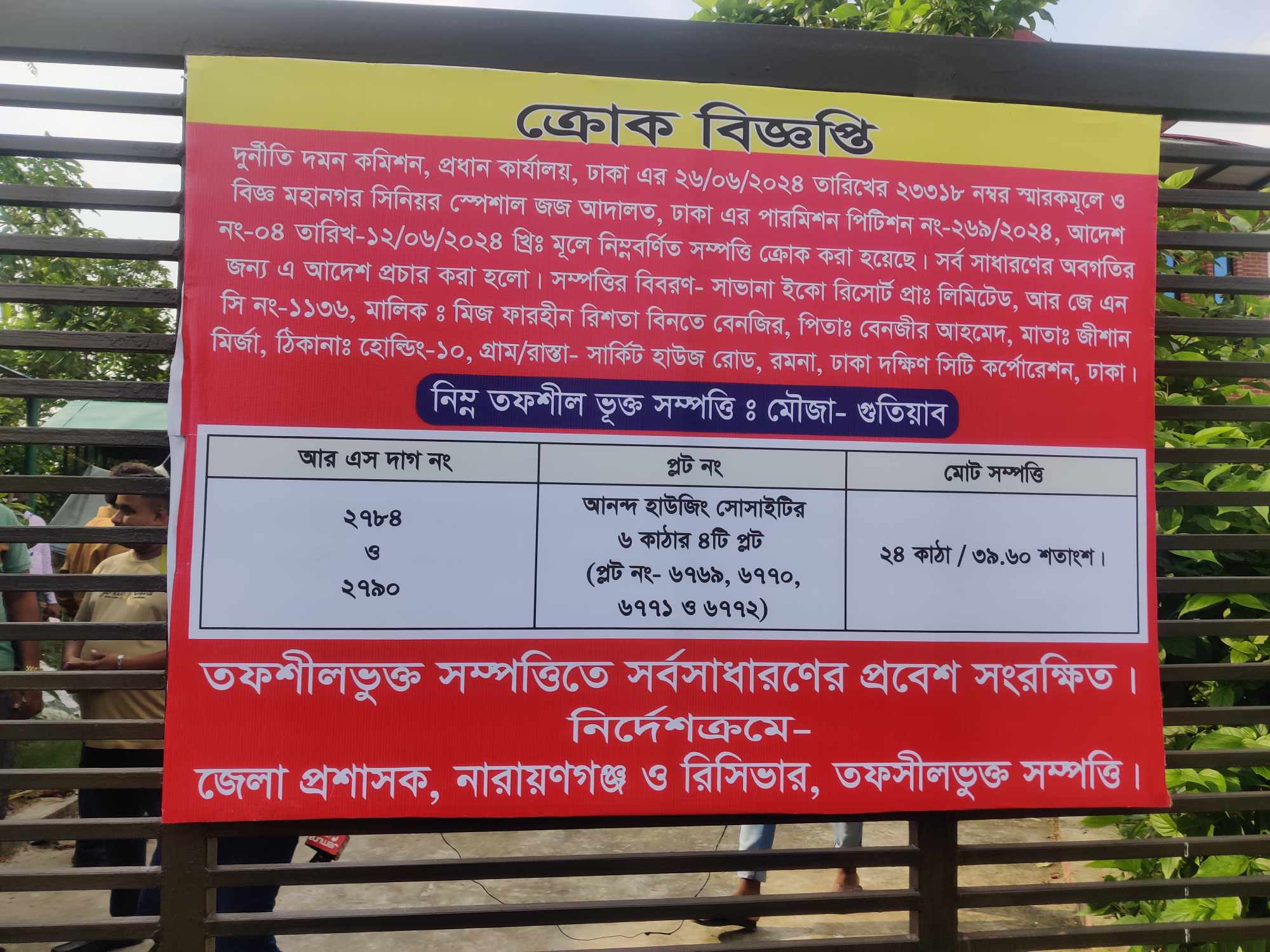 ক্রোক বিজ্ঞপ্তিতে বলা হয়, সাভানা ইকো রিসোর্ট প্রাইভেট লিমিটেড এর ২৪ কাঠা জমির উপরে নির্মিত এই সম্পত্তির মালিক হিসেবে বেনজীর আহমেদের কন্যা মিজ ফারহীন রিশতা বিনতে বেনজির লেখা রয়েছে। আদালতের নির্দেশনা অনুযায়ী তার এই সম্পত্তিটি ক্রেক করা হয়েছে।