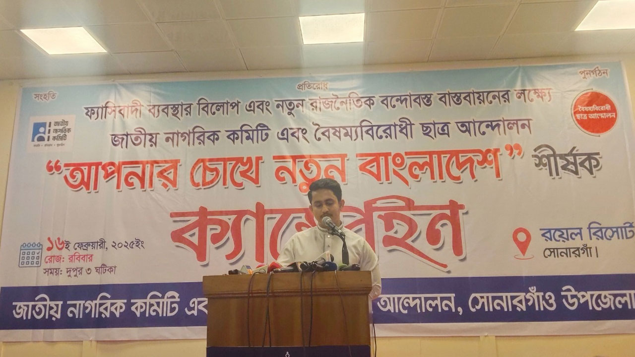 রোববার (১৬ ফেব্রুয়ারি) বিকেলে নারায়ণগঞ্জের সোনারগাঁয়ের রয়েল রিসোর্ট অডিটোরিয়ামে ফ্যাসিবাদী ব্যবস্থার বিলোপ এবং নতুন রাজনৈতিক বন্দোবস্ত বাস্তবায়নের লক্ষ্যে জাতীয় নাগরিক কমিটি এবং বৈষম্যবিরোধী ছাত্র আন্দোলন সোনারগাঁও উপজেলা আয়োজিত ‘আপনার চোখে নতুন বাংলাদেশ’ শীর্ষক ক্যাম্পেইনে তিনি এসব কথা বলেন।